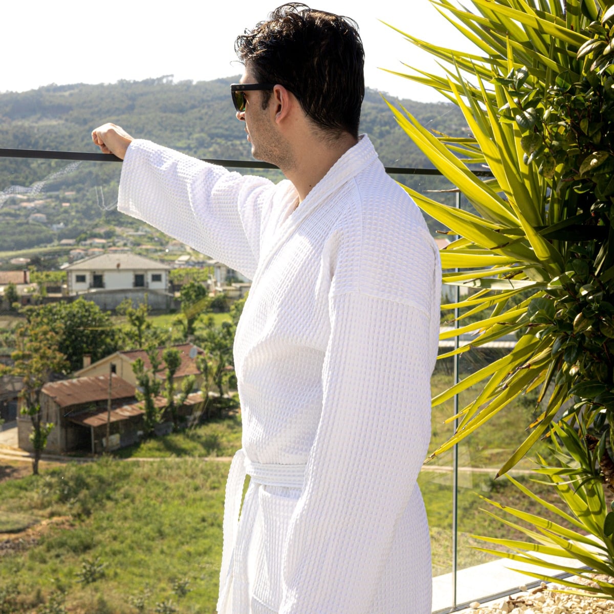 Unser BOUTIQUE SPA Bademantel ist in einem attraktiven Waffelmuster gewebt und zu 100% aus reiner, hochwertiger Baumwolle. Der Bademantel wird nach den höchsten Qualitätsanforderungen in Portugal hergestellt. Sie sind stark und widerstandsfähig und haben ein solides und komfortables Gewicht von 300 Gram pro m2. Das Design ist im Kimono Stil gehalten. Bitte beachten Sie, dass unsere Bademäntel im dreiviertel langen Stil sind. Passende Badeschuhe sind zusätzlich erhältlich.